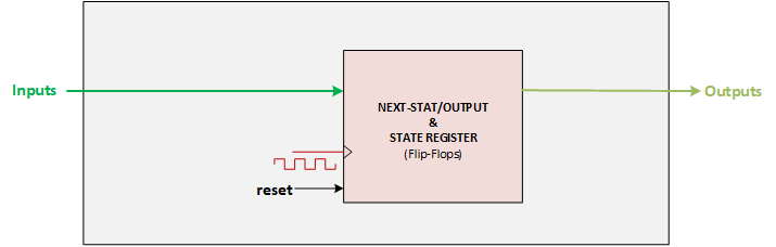 next_state. - Output Logic: logic that computes outputs (Moore or Mealy rules).